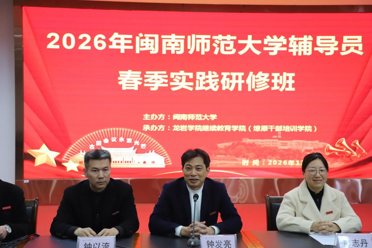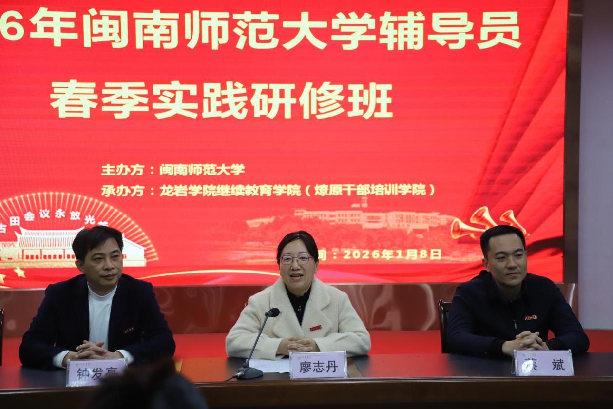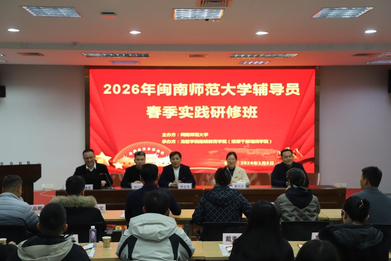 为深入贯彻落实《全面加强新时代福建省高校辅导员队伍建设实施方案》,赋能我校辅导员队伍专业化、职业化、专家化发展,1月8日至10日,学生工作处在龙岩市举办2026年辅导员春季实践研修班,近40名一线辅导员和学生处相关科室人员参训。龙岩学院党委书记钟发亮、闽南师范大学党委副书记廖志丹出席开班仪式。