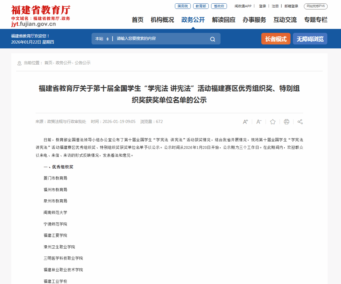 近日,福建省教育厅结合福建省第十届全国学生“学宪法 讲宪法”福建赛区活动开展情况,对获评优秀组织奖、特别组织奖的获奖单位进行公示。闽南师范大学获评优秀组织奖,是获得该奖项的三所本科院校之一,也是我校过去五年中第三次获得该项荣誉。