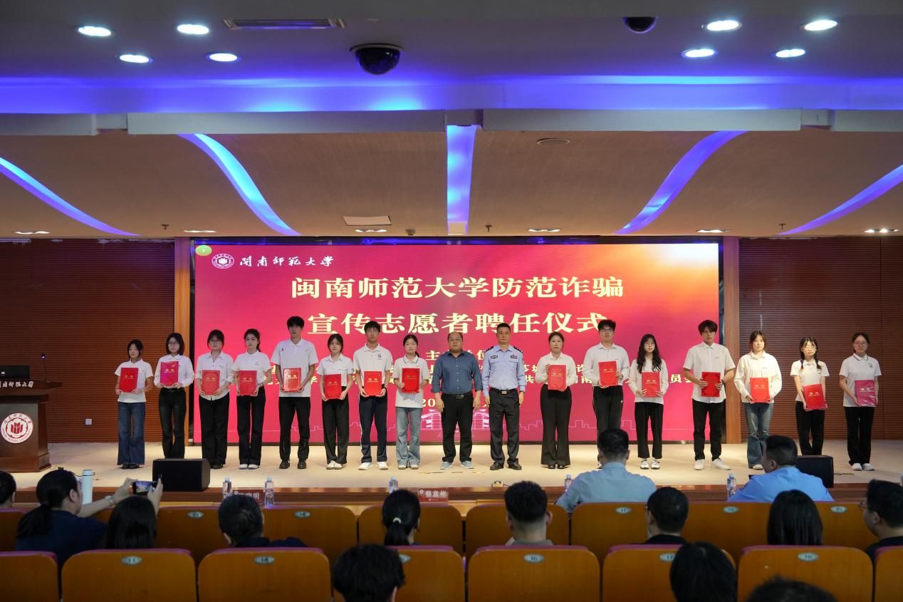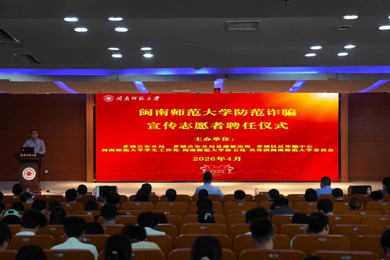 为深化警校联动,筑牢校园反诈防线,探索新形势下防范诈骗的有效途径,4月9日下午,我校在逸夫图书馆五楼报告厅举行防范诈骗宣传志愿者聘任仪式。本次活动由芗城公安分局、芗城公安分局县前派出所、芗城区反诈骗中心及我校学生工作处、保卫处、校团委共同主办。各学院学工办负责人、300多名在校防范诈骗宣传志愿者参加活动。