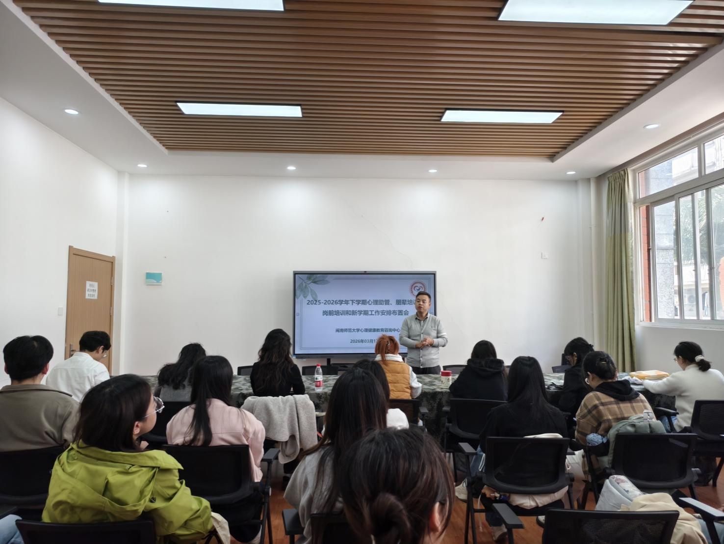 为进一步明晰新学期朋辈心理工作方向,提升心理助管与朋辈培训师的专业能力,3月12日下午3点,学生处心理健康教育咨询中心于芙蓉楼316室开展2025-2026学年下学期心理助管、朋辈培训师岗前培训暨新学期朋辈工作布置会。本次会议由王品卿老师主讲,全体心理助管、朋辈培训师参加。