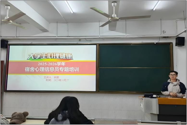 为筑牢学生心理健康防线,提升宿舍心理信息员的工作能力,11月27日晚,文学院在圆山校区旧教104开展宿舍心理信息员专题培训讲座。本次讲座由文学院心理辅导站站长姚震老师主讲,2025级全体宿舍心理信息员参与。